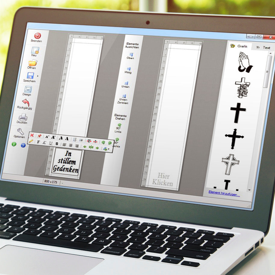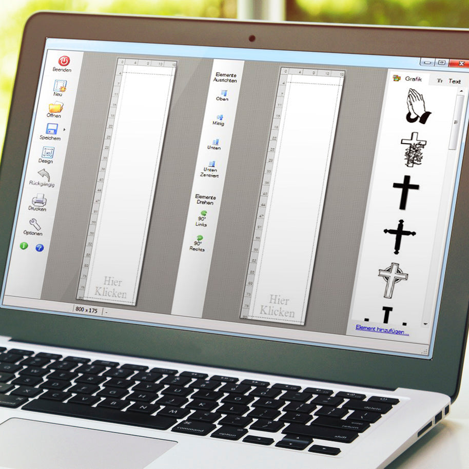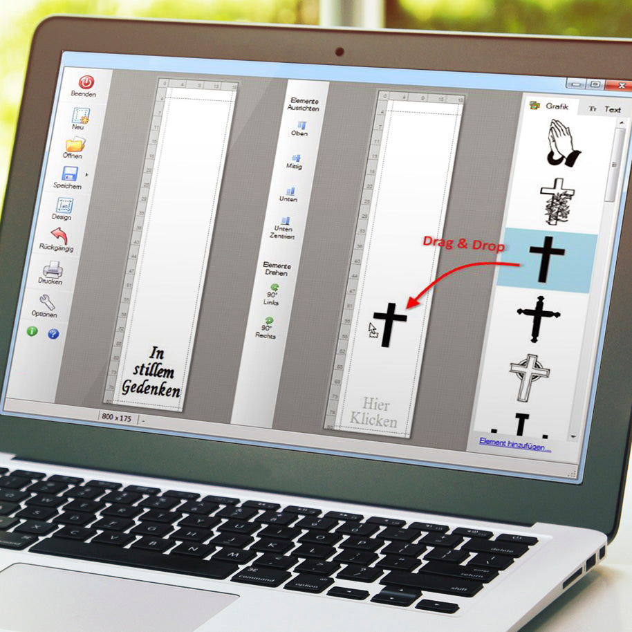 Die Software bietet die Möglichkeit Text- und Grafikelemente frei zu positionieren, zu drehen und in der Größe anzupassen. Texte und Grafiken (Klischees) lassen sich aus der integrierten Bibliothek oder dem eigenen Fundus per Drag & Drop direkt einfügen und beliebig kombinieren (und ausrichten).